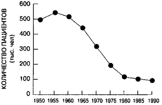 Рис. 16.1. Пациенты психических больниц.За последние 35 лет число пациентов, лечащихся в психиатрических клиниках штатов и округов, сократилось в несколько раз.