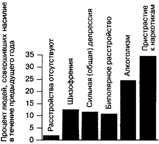 Некоторые специалисты полагают, что принудительные действия оправданы, только если человек потенциально опасен для окружающих. Те редкие, но тщательно муссирующиеся в прессе случаи, когда психически больной человек, у которого возник психотический приступ, нападал на стоящего рядом человека, породили страхи за публичную безопасность. Но бывает трудно определить, опасен человек или нет (Gardner et al., 1996; Lidz, Mulvey & Gardner, 1993). Хотя нам кажется, что лица, страдающие серьезными психическими расстройствами, совершают насильственные преступления чаще, чем нормальные люди (Monahan, 1992) (рис. 16.2), мнения экспертов по поводу того, может ли любой индивид, страдающий психическим расстройством, совершить насильственное преступление, столь же часто оказываются ошибочными, сколь и верными (Monahan & Walker, 1990).