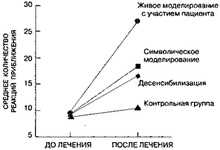 Рис. 16.3. Лечение фобии к змеям.Среднее количество реакций приближения испытуемых к змее до и после лечения их различными видами поведенческой терапии (адаптировано из: Bandura, Blanchard & Ritter, 1969).