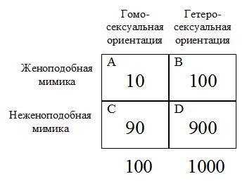 Чтобы правильно оценить наличие корреляции между этими двумя факторами, надо выяснить, отличается ли доля мужчин-гомосексуалистов с женоподобными жестами (левая колонка) от доли гетеросексуальных мужчин с женоподобными жестами (правая колонка). Для этого надо сначала сложить две ячейки каждой колонки и посмотреть, сколько мужчин каждой ориентации есть в этой выборке. Сделав это, мы увидим, что женоподобная мимика проявляется у 10 из 100 мужчин-гомосексуалистов, что составляет 10%, и у 100 из 1000 гетеросексуальных мужчин, то есть тоже 10%. Другими словами, в этих данных отсутствует корреляция между сексуальной ориентацией и женоподобной мимикой.