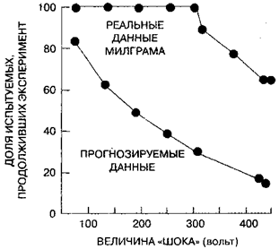 Рис. 18.7. Прогнозируемый и реальный уровень подчиняемости.Верхняя кривая показывает данные Милграма (долю испытуемых, которые продолжали подчиняться в этой ситуации, посылая удары током с увеличением напряжения). Нижняя кривая показывает данные исследования, где испытуемые в ходе ролевой игры прорепетировали эксперимент Милграма и затем пытались предсказать, какая доля испытуемых в реальном эксперименте будет продолжать подчиняться при увеличении напряжения. Оказалось, что испытуемые после ролевой игры сильно недооценивали силу ситуации и вероятность подчинения в ситуации Милграма (по: Bierbrauer, 1973).