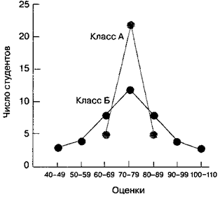 Рис. П3. Пример разной вариации распределений.Как легко видеть, пучок показателей у класса А ближе к среднему, чем показатели класса Б, хотя само среднее в обоих классах идентично — 75. У класса А все показатели попадают между 60 и 89, причем большинство из них приходится на интервал от 70 до 79. У класса Б показатели распределены относительно равномерно по всему диапазону от 40 до 109. Это различие между двумя распределениями в разбросе можно оценить по показателю стандартного отклонения, которое у класса А меньше, чем у класса Б.