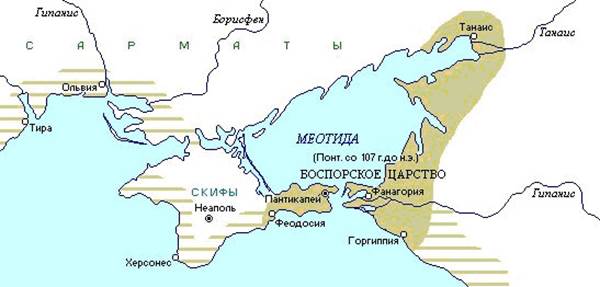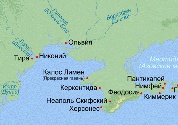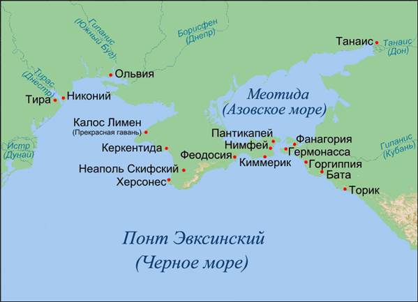 Керченский пролив греки называли Боспором Киммерийским (в отличие от Боспора Фракийского у Константинополя), реку Кубань – Гипанисом, реку Дон – Танаисом, Азовское море – Меотидой.