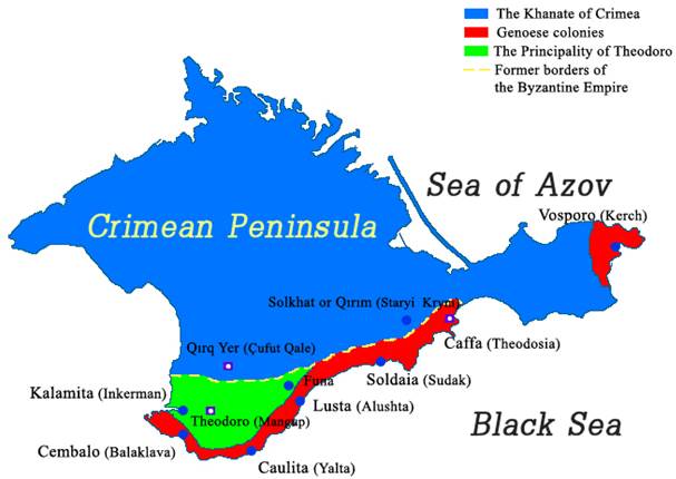 Место греческих колоний на Черноморском побережье с XII века заняли генуэзцы. Генуя и Венеция в это время представляли собой самые развитые в экономическом отношении государства в Европе. В морской торговле они контролировали большую часть рынка хлебопродуктов, оружия, пряностей, строительных материалов и рабов.