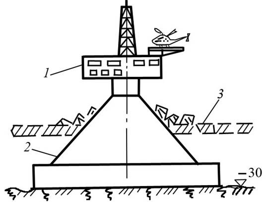Второй способ – ледостойкие гравитационные платформы. Пример такой платформы с конической опорной частью приведен на рисунке.