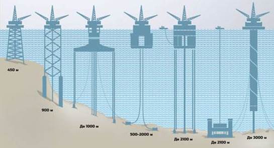 в зависимости от глубины морского дна в районе добычи применяются разные конструкции платформ: стационарные, плавучие, а также системы, установленные на дне
