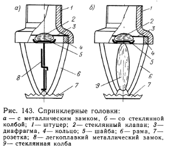 защищаемого помещения, установлены автоматически действующие спринклерные головки (рис. 143). Выходное отверстие спринклера закрыто стеклянным клапаном (шариком), который поддерживают три пластинки, соединенные между собой легкоплавким припоем. При повышении температуры во время пожара припой плавится, клапан открывается, и выходящая струя воды, ударяясь в специальную розетку, разбрызгивается. У спринклеров другого типа клапан удерживается стеклянной колбой, заполненной легко-испаряющейся жидкостью. При пожаре пары жидкости разрывают колбу, в результате чего открывается клапан.