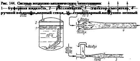 В системе воздушно-механического пенотушения (рис. 144) для получения пены используется жидкий пенообразователь ПО-1 или ПО-6, который хранится в специальных цистернах. При пользовании системой пенообразователь из цистерны эжектором подается в напорный трубопровод, где он смешивается с водой, образуя водяную эмульсию. На конце трубопровода имеется воздушно-пенный ствол. Водяная эмульсия, проходя через него, засасывает воздух, в результате чего образуется пена, которая подается к месту пожара.