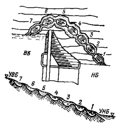 Прудковые рыбоходы устраивают в естественном грунте берега в обход плотины или по откосу земляной плотины. Они представляют собой ряд бассейнов – прудков, соединенных между собой короткими каналами или лотками. Скорость течения в каналах – высокая, а в прудиках – низкая, и рыбы могут в них отдыхать. Прудки делают длиной по 3 – 5 м и глубиной 0,6 – 0,8 м; уровни воды в смежных прудках разнятся на 0,5 – 1,5 м.