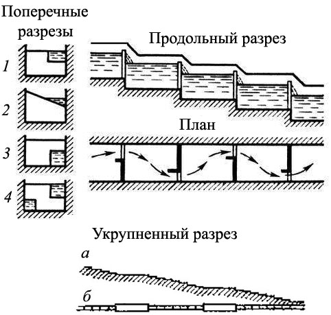 Это каналы, желоба, лотки в которых скорость течения воды зависит от их длины и разности уровней верхнего и нижнего бьефов. Длина таких рыбоходов достигает нескольких километров и, чтобы не делать их слишком длинными, на их верхнем конце устанавливают шлюзы, регулирующие скорость течения. Можно, также создать в канале преграды, замедляющие проток воды: устанавливают в шахматном порядке бетонные блоки, делают чередующиеся неполные перегородки от правого и левого бортов, делают шероховатое бетонное дно, или засыпают дно булыжником.