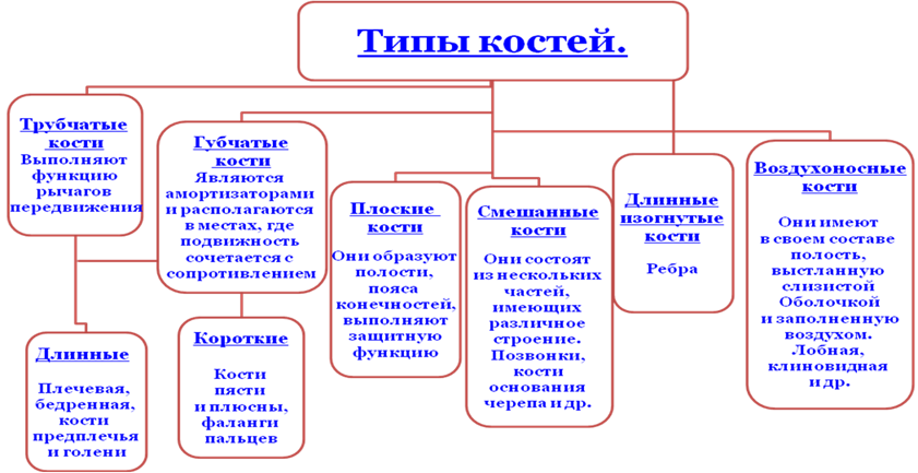 Кости скелета по форме разделяют на четыре основных типа: короткие плоские (лопатка, ребра, кости таза, кости черепа); смешанные (позвонок); длинные трубчатые кости (кости конечностей). Они имеют красный костный мозг – орган кроветворения.