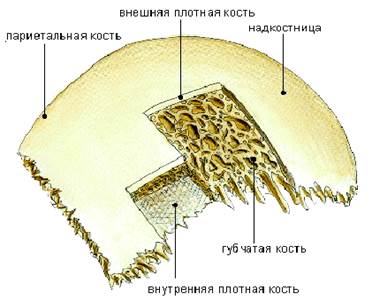 Плоские кости образованы двумя тонкими пластинами компактного вещества, между которыми располагается губчатое вещество, содержащее костный мозг. Губчатое вещество костей черепа носит название «диплоэ».