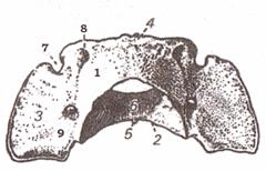 М 1 - коронка имеет 6 бугорков: 2 крупных щечных, средний - язычный и 3 маленьких между ними. Зуб имеет 3 корня: мощный язычный и 2 меньших щечных - медиальный и дистальный. М 2 - коронка имеет 4-5 бугорков: 2 щечных (медиальный и дистальный) и 2-3 язычных. Корней 3, их расположение аналогично таковому у М 1.