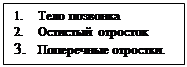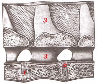 Осевой скелет характеризуется очень высокой прочностью, что достигается наличием мощного связочного аппарата. Он состоит из соединительнотканных и хрящевых образований. Тела позвонков связаны двумя продольными связками, а так же межпозвонковым диском, состоящим из студенистого ядра (1) и фиброзного кольца (2). Остальные части позвонка соединены между собой связками (3). Осевой скелет допускает следующие движения: сгибание и вращение, объем которых в разных отделах неодинаков.