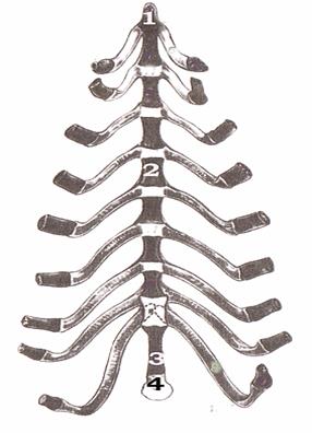 (13 пар рёбер: 9 настоящих, 4 ложных.)