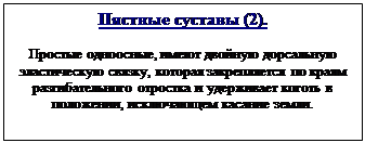• стопой, представленной заплюсной (7 косточек), плюсной (5 косточек) и фаланг пальцев (5 пальцев из 3 фаланг, первый из пальцев висячий (прибылой) и имеет 2 фаланги. На конце пальцев есть когтевой гребень).