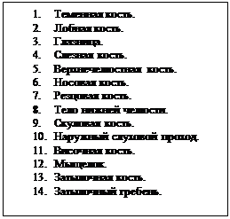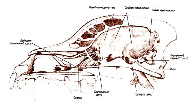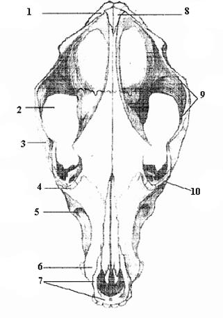 Крышу черепной коробки образуют теменная, межтеменная и лобная кость. теменная кость парная и граничит с затылочной костью. у молодых животных на месте швов образуется затылочный родничок, в котором закладывается парный очажок окостенения. Из него впоследствии формируется непарная межтеменная кость. Лобная кость парная, состоящая из трех пластин. Между пластинами лобной кости образуются синусы (полости, заполненные воздухом и выстланные слизистой оболочкой), которые у собак весьма незначительны. Симметричные синусы не сообщаются, но внутри них есть несплошные перегородки. Поэтому существует возможность проникновения инфекции из одного синуса в другой.