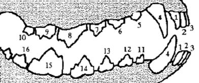 Резцы (I) 6/6; клыки (С) 2/2; Премоляры (РМ) 8/8; моляры (М) 4/6 =42 (20 на верхней и 22 на нижней челюстях)