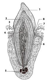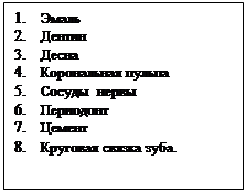 Цемент - ткань, покрывающая дентин в области корня. По строению цемент близок к костной ткани. Состоит из клеток цементоцитов и цементобластов и обызвествленного матрикса. Питание цемента происходит диффузно со стороны периодонта. Внутри зуба имеется полость, которая подразделяется на корональную полость и канал корня, открывающийся вышеупомянутым отверстием верхушки зуба. Зубную полость заполняет пульпа зуба, состоящая из нервов и кровеносных сосудов, погруженных в рыхлую соединительную ткань и обеспечивающих обмен веществ в зубе. Различают корональную и корневую пульпы.