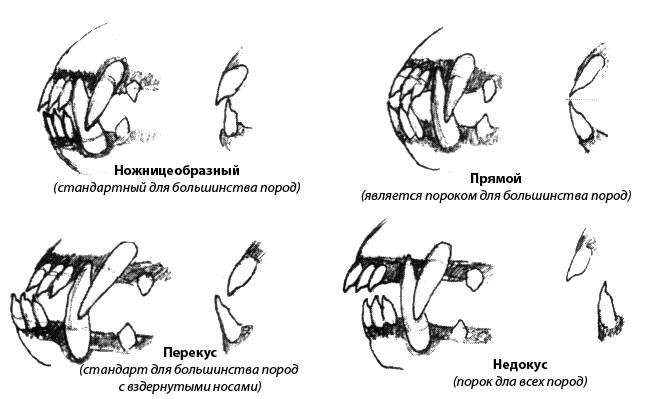 Прикус, при котором, нижние резцы выступают за линию верхних резцов, носит название перекус. При сильно выраженном перекусе, или как его называют бульдожьем прикусе, за линию верхних резцов выходят не только резцы, но и клыки нижней челюсти, что нарушает замок. Примером служит бульдог. У него мёртвая хватка: вцепившись в противника, он уже не разжимает челюстей, а пережёвывает шею противника. У большинства пород собак ножницеобразный прикус.