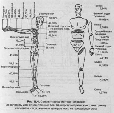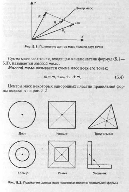 В симметричных однородных телах ЦМ всегда расположен в центре симметрии или лежит на оси симметрии, если у фигуры центра симметрии нет. Центр масс может находиться как внутри тела (диск, треугольник, квадрат), так и вне его (кольцо, угольник, квадрат с вырезом в центре). Для человека положение ЦМ зависит от принятой позы. На рис. 5.3. показано положение ЦМ тела прыгуна в воду на различных этапах прыжка. В зависимости от положения частей тела относительно друг друга его ЦМ находится в разных точках.