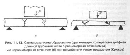 Другой вид повреждений больших трубчатых костей, сопровождающийся множественными переломами, возникает при ударе тупым предметом (рис. 11.13).