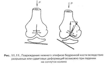 Продольные нагрузки (сжатие) возникают, например, при падении на кисть вытянутой руки, на руку, согнутую в локтевом суставе или на согнутое колено (рис. 11.11).