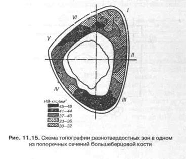 Установлено, что в соответствии с выполнением физиологических задач по реализации опорных и локомоторных функций согласно распределению силовых нагрузок в костях формируются зоны разной твердости. На рис. 11.15 приведена схема топографии разнотвердостных зон в одном из поперечных сечений боль-шеберцовой кости.