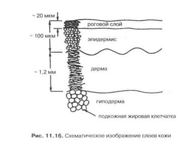 Кожу часто рассматривают как гетерогенную ткань, состоящую из трех наложенных друг на друга слоев, которые тесно связаны между собой, но четко различаются по природе, структуре, свойствам. Схематическое изображение основных трех слоев — эпидермиса, дермы, подкожной клетчатки представлено на рис. 11.16.Эпидермис покрыт сверху роговым слоем.