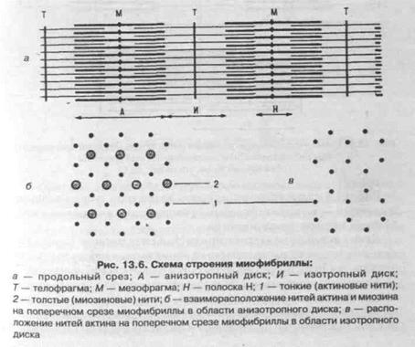 Теория скользящих нитей. Сократительные белки актин и миозин образуют в миофибрилах тонкие и толстые миофиламенты. Они располагаются параллельно друг другу внутри мышечной клетки (рис. 13.6).