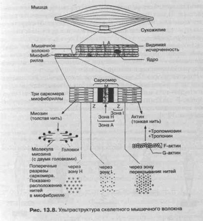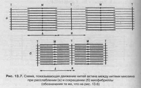 Рис. 13.8 иллюстрирует основное положение теории скользящих нитей — во время сокращения мышцы сами актиновые и мио-зиновые нити не укорачиваются.