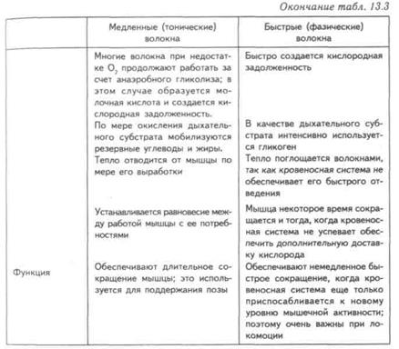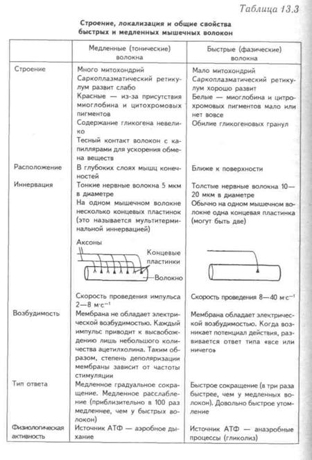 Типы скелетных мышечных волокон. Выделяют два типа скелетных мышечных волокон, каждый из которых имеет свои физиологические особенности. Это медленные (тонические) и быстрые (фазические) волокна. Их строение, локализация и общие свойства указаны в табл. 13.3. Благодаря волокнам этих двух типов организм способен передвигаться и поддерживать позу. Быстрые волокна позволяют мышце сокращаться с высокой скоростью.