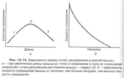 Увеличение нагрузки на мышцу снижает скорость ее сокращения (рис. 13.13,6)