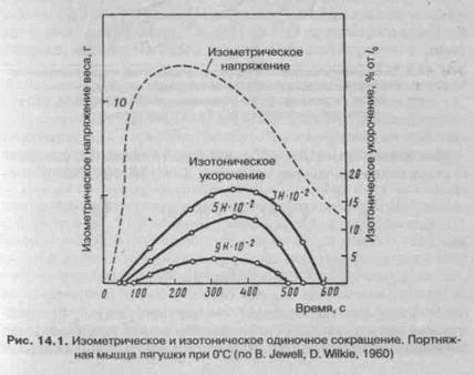 длине развивается усилие, а при фиксированной нагрузке происходит укорочение. Эксперимент с мышцами проводится в двух режимах: изометрическом, когда длина мышцы фиксирована и изотоническом, когда мышца имеет возможность укорачиваться при постоянной нагрузке (рис. 14.1). На рисунке видно, что изометрическое усилие развивается очень быстро и достигает своей максимальной величины примерно через 170 мс после возбуждения. Начиная с 200 мс оно снова уменьшается с возрастающей скоростью. Интересно отметить, что даже через 900 мс в мышце еще сохраняется некоторое напряжение, что может быть обусловлено только активными физическими и химическими процессами.