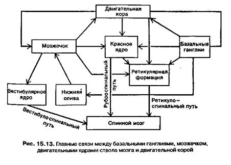 Все сложные движения (локомоций) (ходьба, бег, прыжки и др.) требуют участия центральных областей головного мозга. Эти области регулируют активность мотонейронов спинного мозга через нисходящие спинномозговые пути. К высшим центрам регуляции движений относятся кора головного мозга, осуществляющая контроль как над пирамидной, так и над экстрапирамидной системами, базальными ганглиями и мозжечком (рис. 15.12).