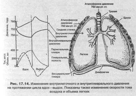 и диафрагме, внутренний (висцеральный) покрывает легкое. Щель между листками называется плевральной полостью. При движении грудной клетки внутренний листок обычно легко скользит по наружному. Давление в плевральной полости всегда меньше атмосферного (отрицательное). В условиях покоя внутриплевраль-ное давление у человека в среднем на 4,5 торр ниже атмосферного (—4,5 торр).