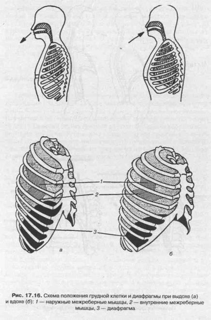 Дыхательные движения осуществляются за счет дыхательной мускулатуры. Расслабление всех связанных с дыханием мышц придает грудной клетке положение пассивного выдоха. Соответствующая мышечная активность может перевести это положение во вдох или же усилить выдох.