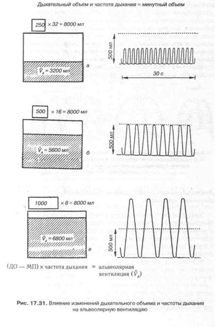 Поскольку МАВ определяет газообмен, уменьшение доли ее в МОД будет приводить к ухудшению газообмена и наоборот. При одном и том же МОД увеличение частоты дыхания (ЧД) приводит к снижению МАВ и, следовательно, к ухудшению газообмена. На рис. 17.31 показано, что один и тот же МОД (8000 мл) может быть получен при разной частоте дыхания (и, конечно, при разном ДО). Но если при нормальной ЧД и нормальном ДО доля альвеолярной вентиляции в МОД достаточно высока и составляет 5600 мл (см. рис. 17.31, б), то при тахипноэ МАВ снижается до 3200 мл, а доля объема, не участвующего в газообмене, увеличивается (см. 17.31, а). Это влечет за собой ухудшение газообмена и увеличение цены дыхания.