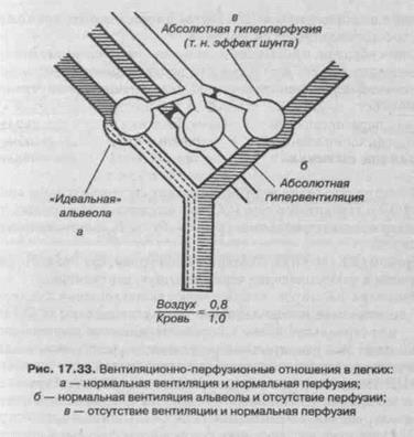 Эффективность газообмена в легких зависит от того, как распределяется объем вдыхаемого воздуха в альвеолах и кровоток в легочных сосудах. В идеальном случае на каждый метр протекающей по легочным сосудам крови в минуту должно приходиться 0,8 л альвеолярного воздуха, т. е. так называемый вентиляционно-перфузионный коэффициент равен 0,8 (рис. 17.33).