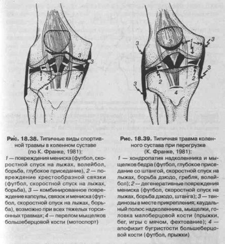 механизм травмы типичен для футбола (рис. 18.37), дзюдо, самбо, горнолыжного спорта, баскетбола, гандбола и др. Действие сил в зонах, расположенных ниже границы разрыва суставной сумки и связок, гиалинового суставного хряща и волокнистого хряща менисков при повторных микротравмах может привести к дегенеративным тканевым изменениям.