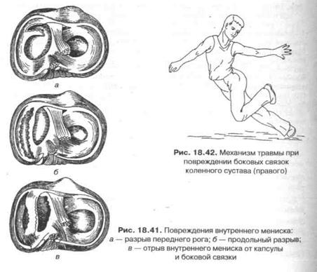 Повреждения менисков (рис. 18.41) — наиболее частый вид травмы коленного сустава. В 80% случаев повреждается внутренний мениск и в 20% — наружный. Чаще всего мениски повреждаются вследствие ротационных напряжений при нагрузке согнутого колена (см. рис. 18.36, 18.42). Отсутствие кровоснабжения полулунных хрящей является причиной их плохого срастания.