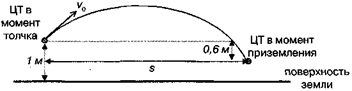 = 3,43 м/с. Прыгун отталкивается в вертикальном положении, а приземляется в «сидячем» положении. При этом центр масс опускается приблизительно на 0,6 м (при отталкивании центр масс находится на высоте ~1 м, а при приземлении на высоте ~0,4 м). Значит координата точки приземления у