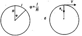 Рис. 3.19.Радианная мера угла (а). Центростремительное ускорение (б)