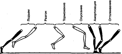Элементы шагательных движений при ходьбе представлены на рис. 3.26. В шагательных движениях каждая нога поочередно бывает опорной и переносной. В опорный период входят амортизация (торможение движения тела по направлению к опоре) и отталкивание, в переносной — разгон и торможение.