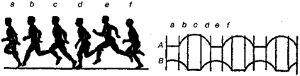 Линии А и В дают качественное изображение движения стоп ног в процессе ходьбы. Верхняя линия А относится к одной ноге, нижняя линия В — к другой. Прямые участки соответствуют моментам опоры стопы о землю, дугообразные участки — моментам движения стоп. В течение промежутка времени (а) обе ноги опираются на землю; затем (b) — нога А в воздухе, нога В продолжает опираться; а после (с) — вновь обе ноги опираются о землю. Чем быстрее ходьба, тем короче становятся промежутки (a и c).