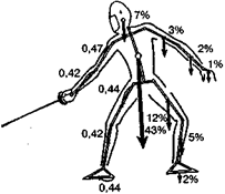 Положение центра тяжести звена указывают как его расстояние от оси проксимального сустава и выражают относительно длины всего звена, принятой за единицу. Геометрия масс тела человека представлена на рис. 5.6.
