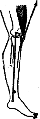 Рис. 7.16.Схема действия мышцы, разгибающей ногу в коленном суставе: плечо r действия мышцы существенно короче плеча r1,стрелкой отмечено направление мышечной тяги