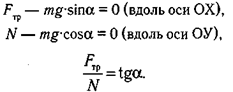 К простейшим механизмам относится и наклонная плоскость. При описании положения тела в этом случае используют прямоугольную систему координат, ось ОХ которой направлена параллельно плоскости, а ось ОУ — перпендикулярно ей. На тело, расположенное на наклонной плоскости, рис. 7.18, действуют сила тяжести mg, сила реакции опоры — N и сила трения Fтр . Проекции сила тяжести на координатные оси равны mg·sinα (скатывающая сила) и mg·cosα.