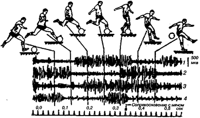 Рис. 9.16.Биоэлектрическая активность мышц ноги спортсмена,