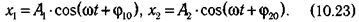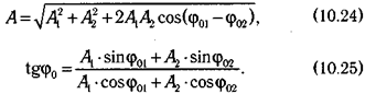 Пусть тело одновременно участвует в двух колебательных движениях, происходящих вдоль одной линии. Требуется записать закон, по которому изменяется смещение тела в этом случае. Приведем без вывода решение этой задачи для случая, когда частоты обоих колебаний одинаковы.